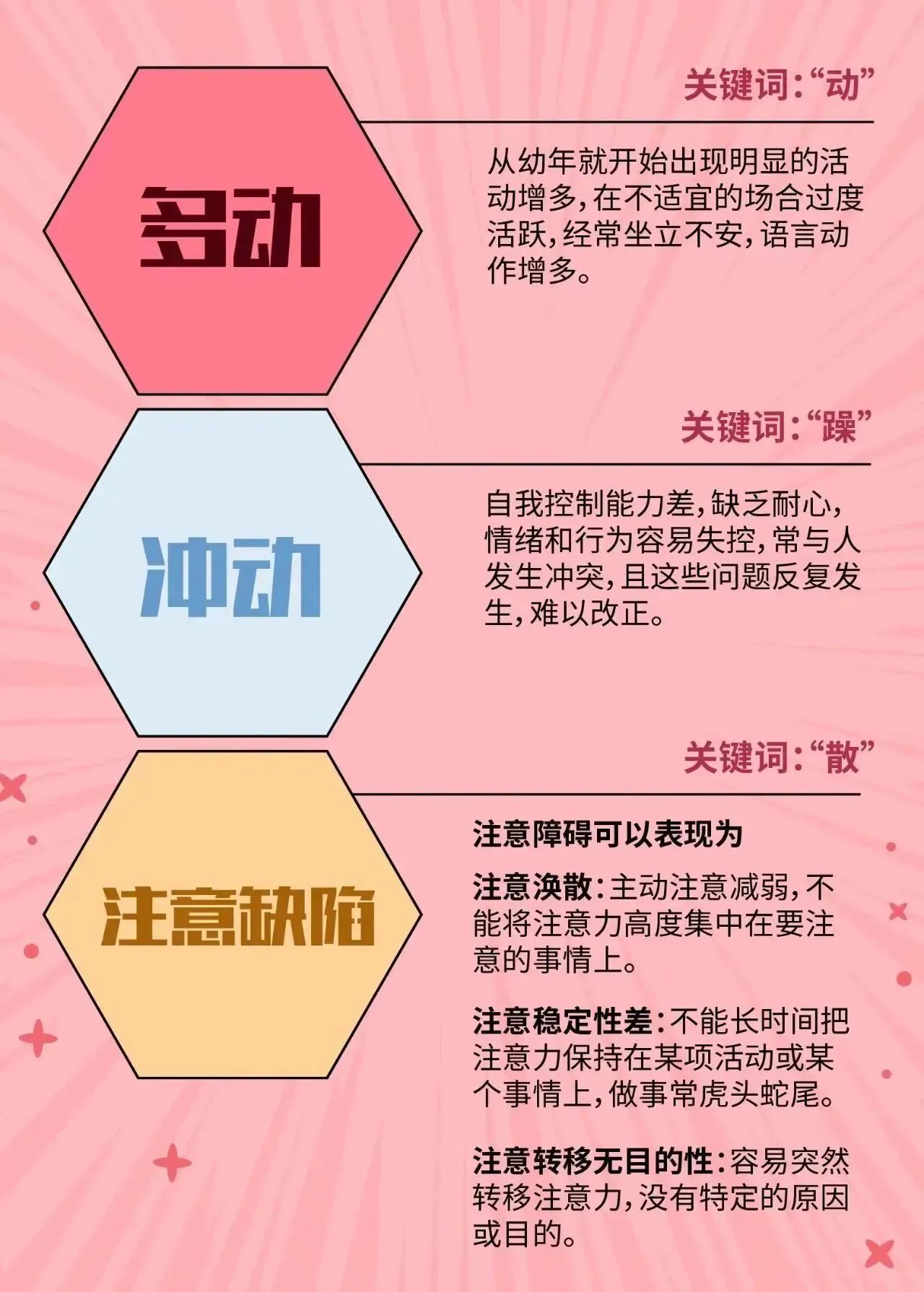 孩子上二年級(jí)了,寫作業(yè)的效率不高,要喊半天才磨磨嘰嘰挪到桌子旁邊,其他同學(xué)半小時(shí)能搞定的作業(yè),她要寫上50分鐘,甚至更久。給她說了:作業(yè)做完之后,可以做自己想做的事,包括看動(dòng)畫片、打游戲等;平時(shí)也毫不吝嗇對(duì)孩子的贊美,但效果卻不大。有時(shí)吃完晚飯就開始寫作業(yè),也要耗3、4個(gè)小時(shí),寫到深夜才勉強(qiáng)做完,既擔(dān)心她身體吃不消,也憂心她學(xué)習(xí)跟不上。 我兒子從2歲開始就難以控制自己的情緒。一開始,以為是孩子自我意識(shí)逐漸形成的叛逆期,也沒有放在心上,覺得過一陣就好起來。但是,隨著年齡的增長(zhǎng),他的情緒問題卻愈加嚴(yán)重了。在球場(chǎng)上,他一被斷球就會(huì)推人犯規(guī);在教室里,他一做錯(cuò)題就把試卷揉成一團(tuán);回到家里,他稍有不順意就直接用頭去撞地板和墻壁……真的令人非常頭疼。 我去開完家長(zhǎng)會(huì)后,老師還特意提醒說,孩子在課堂上常常注意力不集中,總是在偷偷摳橡皮、看窗外,剛教的例題,原封不動(dòng)地搬過來也不會(huì)做,希望我在家也能多注意一下。 上面這些孩子他們有什么共性? 他們就只是故意讓父母頭疼? 或者是家長(zhǎng)不知怎么管教“熊孩子”? 沒有孩子愿意天生就和父母對(duì)著干 他們可能是生病了 對(duì)于孩子而言,一兩次難以集中注意力、偶爾管不住自己的脾氣都是正常的。但是,有的孩子長(zhǎng)期難以集中注意力、反復(fù)與長(zhǎng)輩或小伙伴發(fā)生沖突,可能從幼年或小學(xué)入學(xué)開始就持續(xù)出現(xiàn)一些癥狀,包括: 當(dāng)孩子上面這些表現(xiàn)明顯比同齡孩子更明顯時(shí),父母就一定要需要重視起來,因?yàn)樗鼈兛赡茴A(yù)示著孩子患上了注意缺陷多動(dòng)障礙,也就是家長(zhǎng)口中的“多動(dòng)癥”。 肯定有家長(zhǎng)要問「這不就是一般調(diào)皮小孩都可能出現(xiàn)的問題,如果說這是一種疾病,那么豈不是很多父母都要帶孩子去干預(yù)了?」美國(guó)兒科學(xué)會(huì)和美國(guó)疾控中心的《多動(dòng)癥:父母指南》官方手冊(cè)建議,當(dāng)這些癥狀出現(xiàn)以下影響時(shí),父母就要及時(shí)帶孩子去就確診、干預(yù)了。 需要注意的是 孩子正處于各類生活、社交、學(xué)習(xí)技能 建立和發(fā)展的關(guān)鍵時(shí)期 如幼年時(shí)出現(xiàn)了這些癥狀卻不加干預(yù)的話 可能影響孩子長(zhǎng)期的學(xué)習(xí)、社交能力 甚至影響升學(xué)、就業(yè) 這些孩子可能到成年以后 依然會(huì)被這些問題所困擾 甚至相伴終身