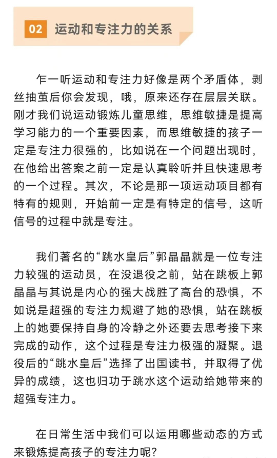 以動(dòng)制靜策略 制定規(guī)則、明確目標(biāo) 不論是在家中還是在課堂都可以利用兒童發(fā)展天性,學(xué)會(huì)用游戲來(lái)提高專注力,前提一定要制定可執(zhí)行規(guī)則。比如說(shuō)聽到書,就要找到與書相關(guān)的物體但是不可以拿書;聽到籃球,就要找到與籃球同類的物體但是不可以拿籃球...增強(qiáng)傾聽專注力和思維靈敏。 提高自控、增強(qiáng)執(zhí)行 執(zhí)行力需要自控,而自控需要專注力,抑制內(nèi)心的沖動(dòng),學(xué)會(huì)冷靜思考。在日常生活中我們可以這樣做,明確分配每一位家庭成員的家務(wù)任務(wù),需要在規(guī)定時(shí)間內(nèi)完成,并且由所有家庭成員認(rèn)可通過(guò)后才可以獲得觀看漫畫書或者動(dòng)畫片的權(quán)利。長(zhǎng)期養(yǎng)成習(xí)慣提高執(zhí)行力,且通過(guò)規(guī)則等待提高自控力。 多變引導(dǎo)、刺激興趣 為什么孩子看動(dòng)畫片、玩游戲可以紋絲不動(dòng),可是一寫起作業(yè)就東張西望;玩樂(lè)高能玩1小時(shí),看書堅(jiān)持不了10分鐘?孩子的專注力不夠還有另外一個(gè)因素就是興趣,如果孩子對(duì)看書不感興趣,再怎么逼都沒有,不光是孩子,成人也是一樣。那我們?cè)谌粘I詈驼n堂中可以經(jīng)常變化玩法,比如減少看電視時(shí)間可以一起出去拿快遞;上課坐不住了可以穿插不同小游戲,還可以通過(guò)聲音變化、服飾變化引起孩子關(guān)注······最終的目的要將孩子的無(wú)意注意轉(zhuǎn)化為有意注意。多變化式引導(dǎo),尋找孩子的興趣點(diǎn)。 但心理學(xué)上,專注力的關(guān)聯(lián)還有很多方面,如注意力和認(rèn)知能力有關(guān),和視覺搜索有關(guān),和情緒有關(guān)等等。我們需要多理解和接納孩子。生活因動(dòng)而有趣,因多變而精彩,注意動(dòng)靜結(jié)合,也要學(xué)會(huì)以動(dòng)制靜,不要一昧的壓制打造一個(gè)“坐如泰山”的孩子。